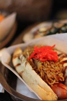 A hot dog (also spelled hotdog) is a cooked sausage, traditionally grilled or steamed and served in a sliced bun as a sandwich. Hot dog variants include the corn dog dipped in corn batter and deep fried, pigs in blankets wrapped in dough, baked, and served as hors d'oeuvres, and Beanie Weenies chopped and mixed with baked beans. Typical hot dog garnishes include mustard, ketchup, onions, mayonnaise, relish, cheese, chili, and sauerkraut.