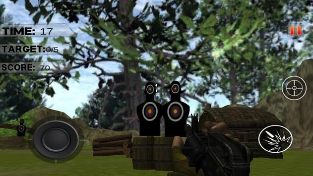 Initial levels are simple, You get the target, fix the aim and shoot. More scores if you shooting right in the center of target. Get as many scores as you can to play the next expert levels. Expert levels give you training on moving objects, Shoot the moving objects, consider them enemy soldiers and shoot them right in the head or chest.