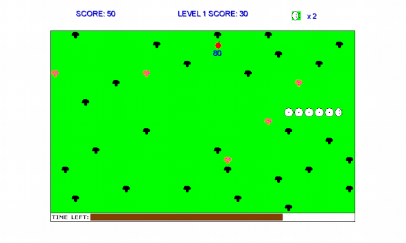 Slither is a simple snake game. Guide the snake to eat the mushrooms and avoid the toadstools. Eat the bonus cherries for extra points. If you run out of time, you lose a life. If you finish with time to spare, you get bonus points.