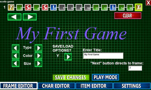 The games you make will consist of frames; each frame can be one of four things, a title, an overworld, a shop, or a cinematic. The game will always start on frame 1, but from there, frames do not have to play in sequence. Each frame will have options to set where a player will go when leaving the frame. To create a new frame, click the "empty" grey frames along the top of the level editor screen. Then pick what type of frame you will create from the menu. Here are the types of frames:
