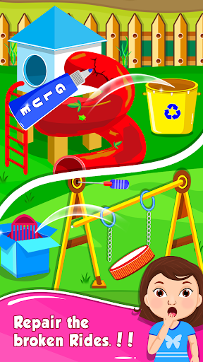Throwing trash to dustbin and dusting plus fixing of Rides in the Playground