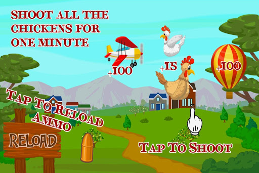 Play chicken hunt game! Pop flying chickens in the sky and get 15 points. Pop an airplane and balloon and get 100 points. Get points and complete levels! Chicken Hunt Well, dag-nabit looks like the chickens got loose again and now they're all over the farm! That's OK though because that means now you can play Chicken Hunt, the fast paced 2D action shooting game for Android. Blast your way through wave after wave of chickens, hot-air balloons and bi-planes. The simple controls and game play make Chicken Hunt as kid friendly as the cute colorful graphics. Simply tap the screen to shoot all the birds, airplanes and hot-air balloons you can in one minute to score enough points to pass the level. Tap the sign to reload your gun and blast away some more. Chickens are work 15 points hot-air balloons are 100 and if you manage to take down a plane by shooting it three times, they're worth 100 as well. Levels get harder and harder until the screen is covered in targets. Can you shoot your way through all the levels to win the game? Can you beat the high score? You can find out now, because poultry is on the menu and so is this additive free game for Android!