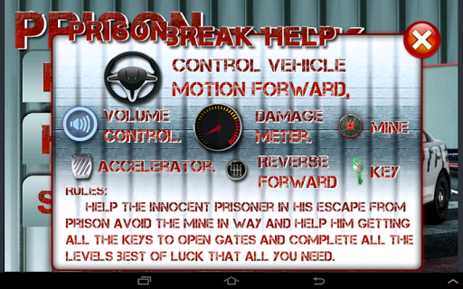 The Player is in prison and has been sentenced to death for a crime he did not commit, Now he hijack a police car and make his way out of jail and had a jail break plan. All he had to do is avoid the mine in way, each level have 2 to 5 mine.