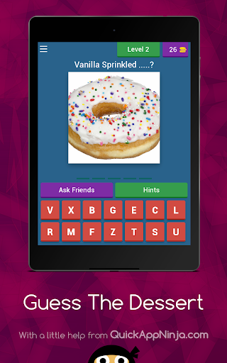 Guess The Dessert will test your knowledge of desserts. From the given picture & description/hints, and with selection of letters you try to guess the desserts. The right answer will take you to the next level. :)