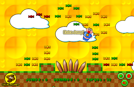 Jump and eat candies, take special powers by eating Colored Jellys, avoid obstacles and enemies to find the way back home in 35 sweet platforming levels.