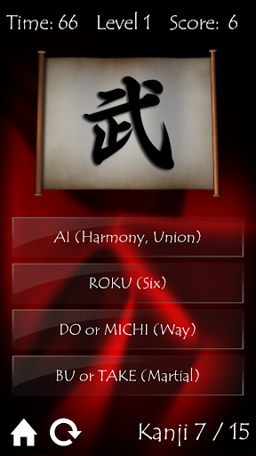The Aikido Kanji Quiz presents 75 kanji over 4 levels of difficulty. Each level represents a logical grouping of kanji, such as counting or anatomy and the app presents both Japanese and English meanings of each kanji to boost your knowledge! Can you recall all kanji in record time?