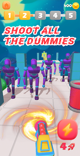 Shoot the dummy as you go! When you hit the dummy, it will fall. You need to clear all the dummies and get to the end.