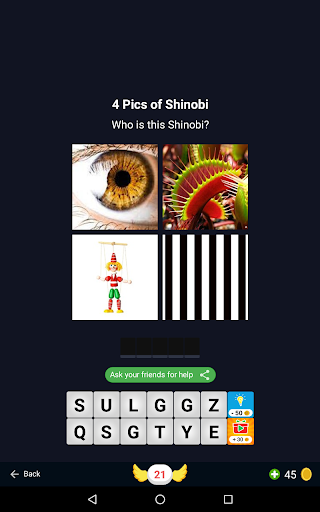 4 Pics of Shinobi part 1 is a game where you have to guess the Shinobi from Konoha. The levels are selected and complicated as much as possible in Russian. The game is free and offline without internet!