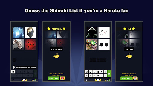 4 Pics of Shinobi in Russian is a game where you have to guess the Shinobi from the anime series "Naruto". The levels are selected and complicated as much as possible for the player's interest.