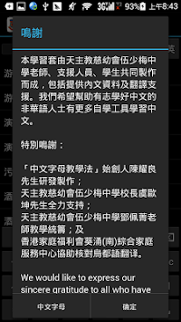 We would like to express our sincere gratitude to all who have contributed to the development of this self-learning App. We would like to thank the Salesians of Don Bosco Ng Siu Mui Secondary School(Including teacher, support staff and students) for their commitment to this project. We hope that this tool can assist the non-Chinese speakers in learning Chinese more easily.