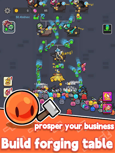 Starting from a small forging table, weapons are shipped and sold, and gold coins are loaded into treasure chests. Upgrade with gold. The higher the grade, the faster it can be built and the higher the price. Open a new production line, ship and sell your weapons, and fill your gold chests!