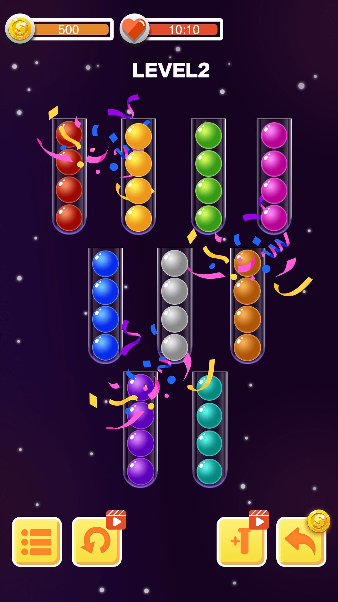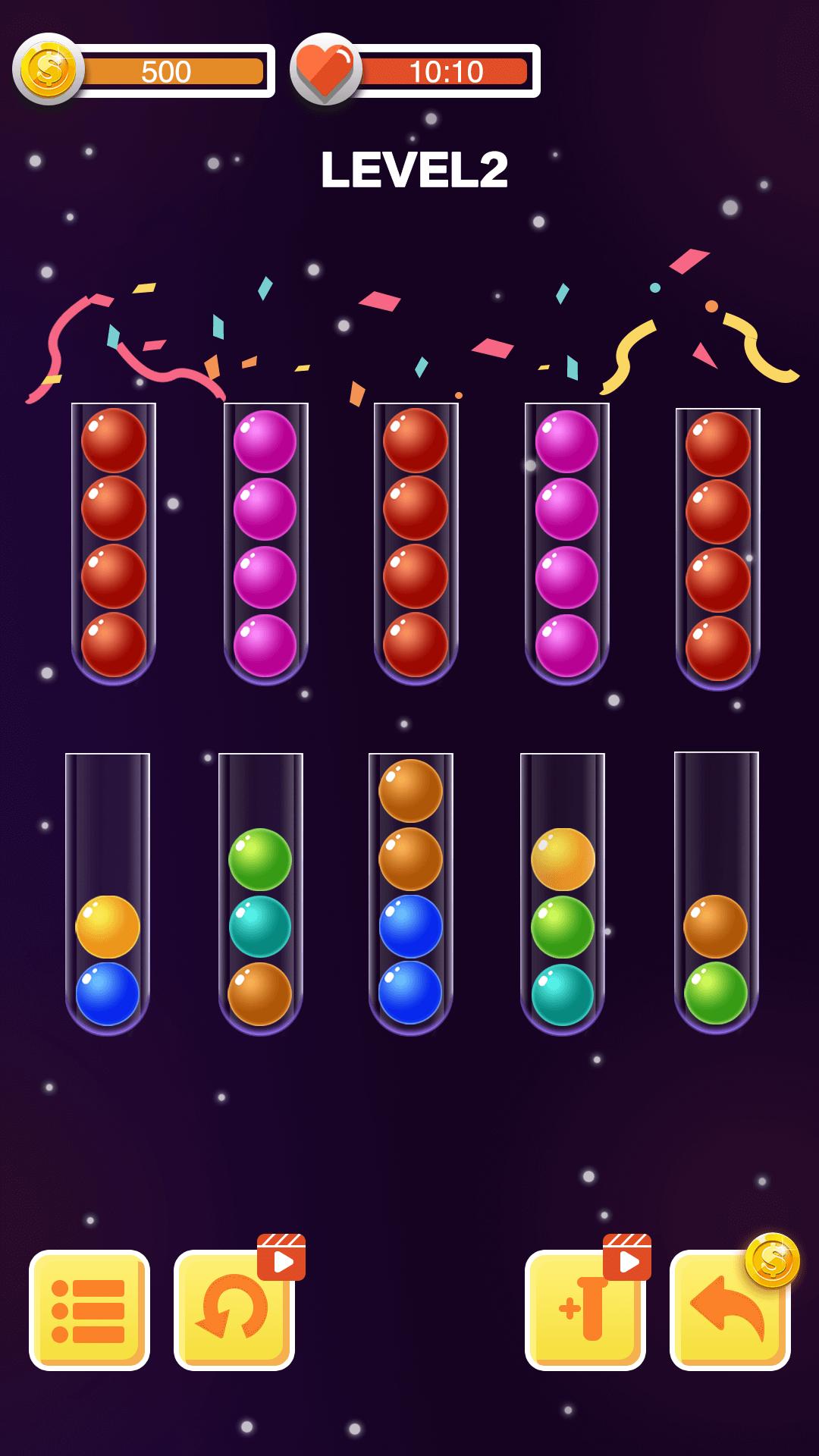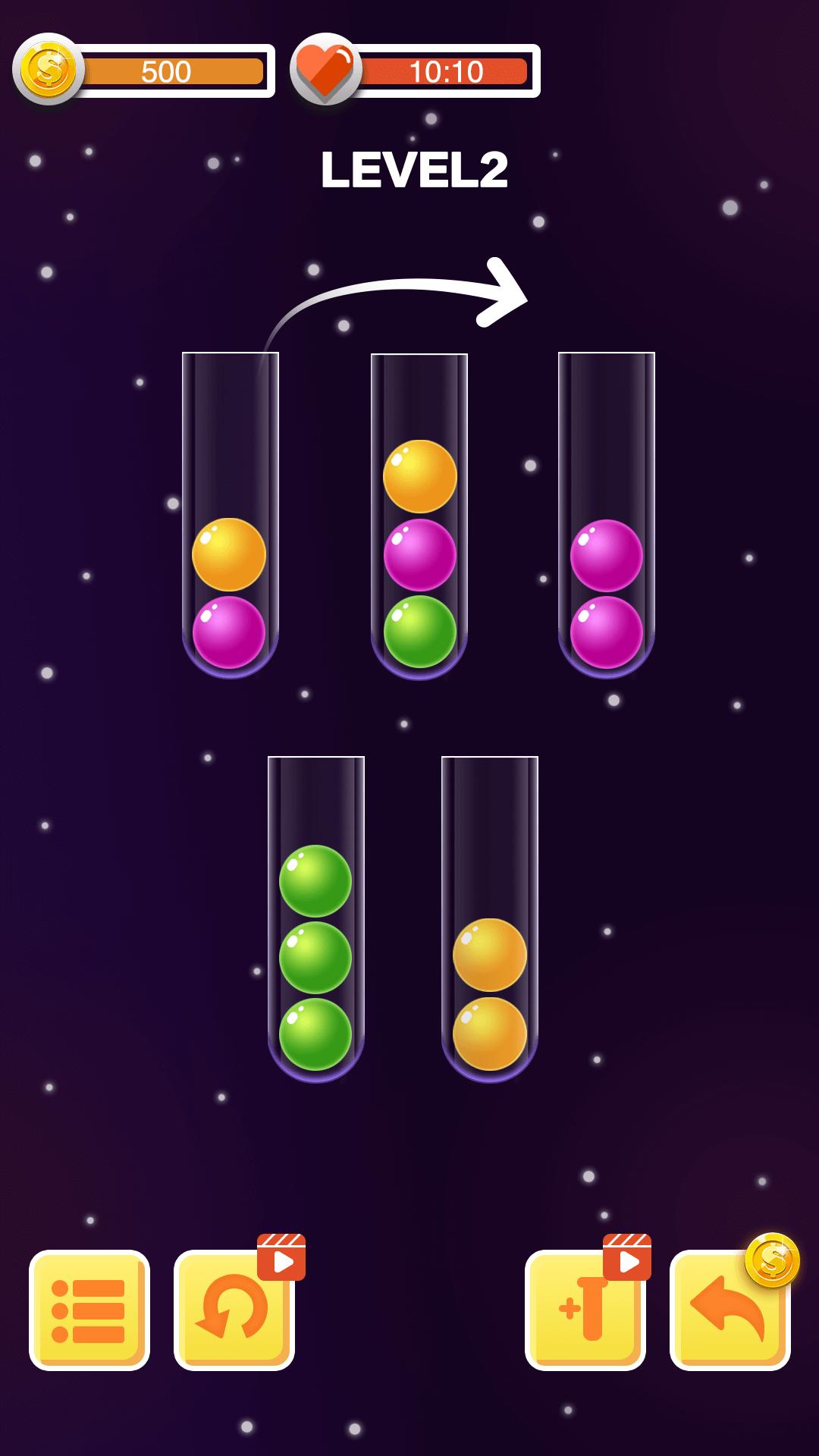 -Click to move the ball, only the balls of the same color can be placed in the same tube.