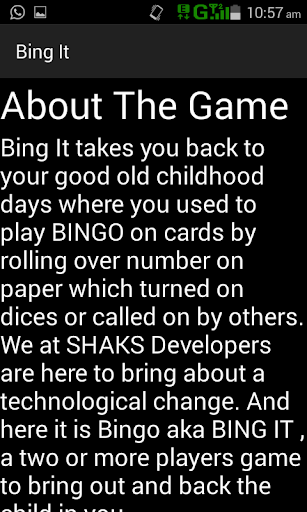 "Bing It" takes you back to your good old childhood days where you used to play "BINGO" on cards by rolling over number on paper which turned on dices or called on by others. We at "VoidCode Developers" are here to bring about a technological change. And here it is Bingo aka BING IT , a two or more players game to bring out and back the child in you.