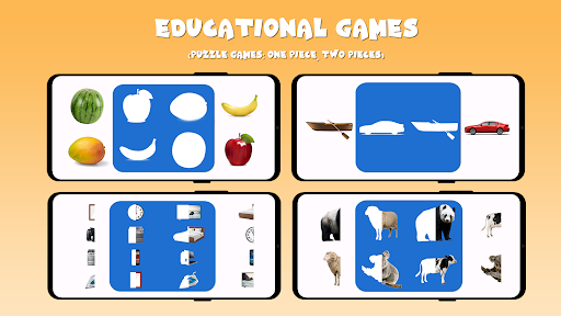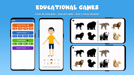 Educational games for speech are included like: one piece and two pieces puzzles , word / picture recognition & discrimination, shape & shadow game for words and body parts games.