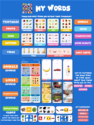 My words has lot of amazing features including sounds of animals, birds, vehicles and various types and levels of educational games for kids.