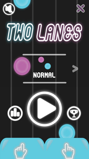 Two Lanes is an arcade style reaction based game. Players must control two switches at the base of the screen by tapping to switch between two colors. Colored circles move downwards on either side of the screen in line with each switch.