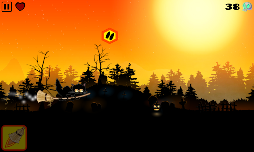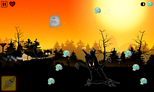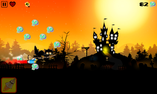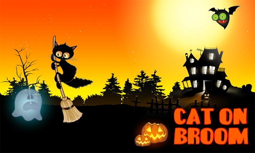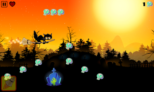 Flying Cat on a broom in the endless mode. Сatch boosters and collect as many skulls. Dodge the ghost and other obstacles.