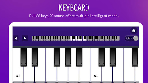 The application can also be used as a piano without learning mode. There is also an option to record your own songs. The recording function will allow you to save your musical compositions and play them later. You can set the amount of visible piano keys from 10 to 24. You can move the keyboard with one key or one octave to the right or to the left. This magic keyboard piano will be like your virtual teacher.