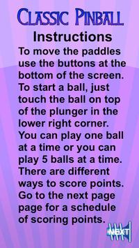 Classic Pinball was designed with the old pinball machines in mind. It is like traveling back in time to a pinball arcade of the 60's or 70's. It is great fun and it is challenging. A great game to play at any time by anyone. A player has 10 pinballs to score as many points as possible. You can play as many games as many times as you would like. During the session of playing, the game keeps track of your high score. Test your skills and compare them to your friend's skills.
