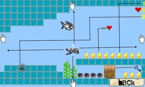 Find the somewhat obfuscated treasure chest underwater Before looking for a chest get him the key, beware of sharks and stars