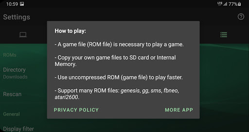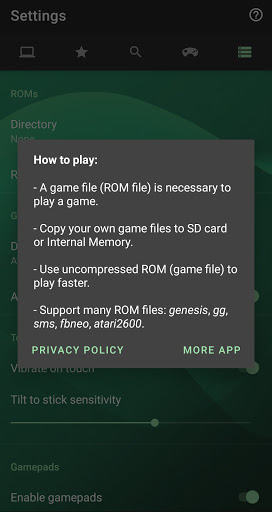 How to play: - A game file (ROM file) is necessary to play a game. - Copy your own game files to SD card or Internal Memory. - Use uncompressed ROM to play faster. - Supports many ROM files (gg/gen/sms/etc).