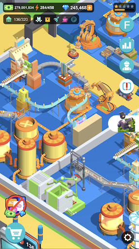 In the beginning you will craft mechanical arm, build production line of foods, transport products to customers, promote advertisement and research for the better taste and efficiency.