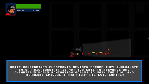 Tetsuo World is a science fiction platform game, set in a dystopian society occupied by robots and aliens, controlled by an evil scientist: Dr. Chinpira. His main objective is world supremacy through reengineering electronic devices to reject human activity. Tetsuo, a gifted computer science major, is the only individual who can penetrate Dr. Chinpira's software. If Tetsuo does not immobilized these possessed beings in time, these ordinary objects will turn against humanoids, from innocently following pedestrians to full-on assaultive behaviors. Eventually, these mundane machineries will amalgamate into a big boss, in which, Tetsuo has to terminate for humanity's future! But don't worry, occasionally a companion named Daichi will surface and offer his wisdom on strengths and weaknesses of each boss. Further, tooltips with hints on strategic mechanics on how to enter Dr. Chinpira's transporter will be provided to Tetsuo. As the story progresses, Tetsuo will discover other hidden abilities, such as his supernatural punching power and pushing strength, as he is forced to intellectually outwit traps and obstacles deliberately set by Dr. Chinpira from entering his multiple laboratories. In essence, in each stage, Tetsuo has to enter Dr. Chinpira's transporter and infiltrate his software, and at the same time, locate and bring him to justice!