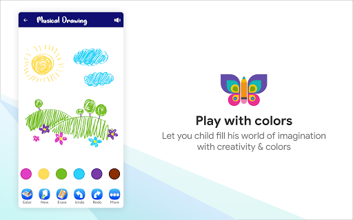 The musical drawing section helps children in improving their cognitive skills. They learn to recognize colors and how to draw different shapes. This gives you a clean sheet on the screen to draw anything they want. They can choose from the five given colors to paint the sheet on the screen. To help them learn, each time you pick a color, the name of the color will be played. For example, if you choose pink, the sound will say Pink, or if you choose green, the sound will play Green. Other instructions such as undo, redo, erase, and save will be played on the sound.
