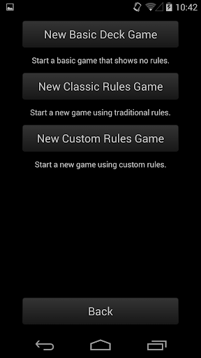 You can play a basic game which just simulates a deck, a "classic" game with suggested rules or a custom game with your own rules.
