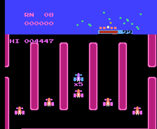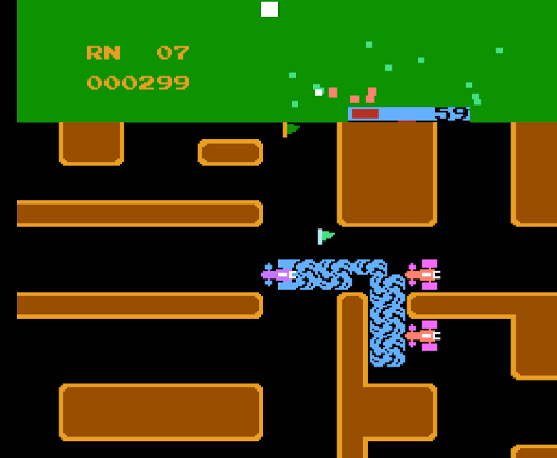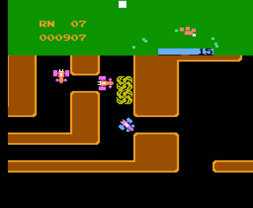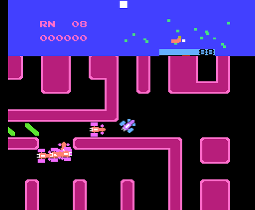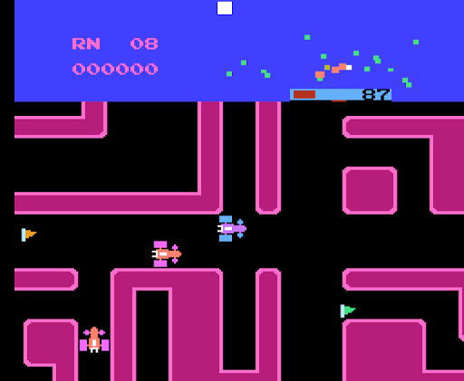 Several red cars chase the blue one around the maze, and contact with any of them results in losing a life when hit. The number of these cars begins at three and increases in number throughout next round to five. However, the player has a smokescreen, to use against the red cars. If a red car runs into a cloud of smokescreen, it will be momentarily stunned (but will still kill the player on contact). Using the smokescreen uses a small amount of fuel.