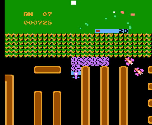 The car has a limited amount of fuel which is consumed with time, though it is normally sufficient to last until all flags have been collected. When fuel runs out, the smoke screen no longer works, so it very quickly falls victim to the red cars. If the player should clear any round without any fuel remaining (a rare occurrence), they will not receive a fuel bonus as a result.
