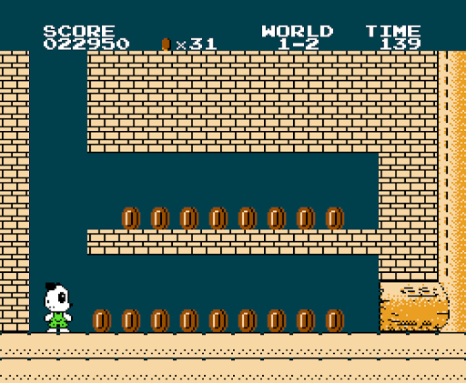 The game consists of eight worlds with four sub-levels called "stages" in each world. The final stage of each world takes place in a castle where Boss is fought above a suspension bridge; the first seven of these Bosses are "false Bosses" whom are actually minions disguised as him, whilst the real Boss is found in the 8th world. Boss and his decoys are defeated by jumping over them and reaching the axe on the end of the bridge, although they can also be defeated using a Fire Leaf. The game also includes some stages taking place underwater, which contain different enemies. In addition, there are bonuses and secret areas in the game. Most secret areas contain more coins for Panda to collect, but some contain "warp pipes" that allow Panda to advance directly to later worlds in the game without completing the intervening stages. After completing the game once, the player is rewarded with the ability to replay the game with changes made to increase its difficulty.