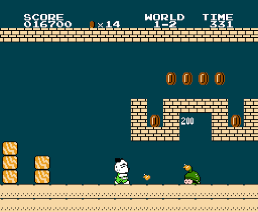 Panda’s primary attack is jumping on top of enemies, though many enemies have differing responses to this. Some enemies will flatten and be defeated, while others will temporarily retract into its shell, allowing Panda to use it as a projectile. These shells may be deflected off a wall to destroy other enemies, though they can also bounce back against Panda, which will hurt or kill him. Other enemies, such as underwater foes and enemies with spiked tops, cannot be jumped on and damage the player instead. Panda can also defeat enemies above him by jumping to hit the brick that the enemy is standing on. Panda may also acquire the Fire Leaf from certain music note blocks that when picked up changes the color of Panda outfit and allows him to throw fireballs. A less common item is the Star, which often appears when Panda hits certain concealed or otherwise invisible blocks. This item makes Panda temporarily invincible to most hazards and capable of defeating enemies on contact.