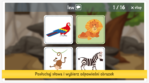 Słowa: papuga, lew, małpa, zebra, słoń, żyrafa, wielbłąd, krokodyl, hipopotam, kangur, i 6 więcej!