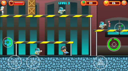 Many kinds of enemies like:white robot,blue robot, green robot,red robot,tank,helicopters