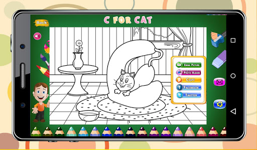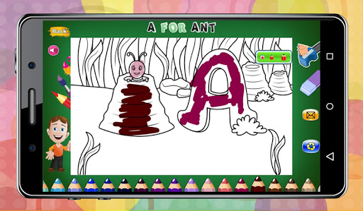 The coloring book app for kids displays all alphabets by 26 ABC Coloring Pages and 10 Number Learning Coloring Pages. As you tap on a tab, an alphabet and an image will appear on-screen. The kid can learn the letter, color the letter and the image by using 35 color pencils.