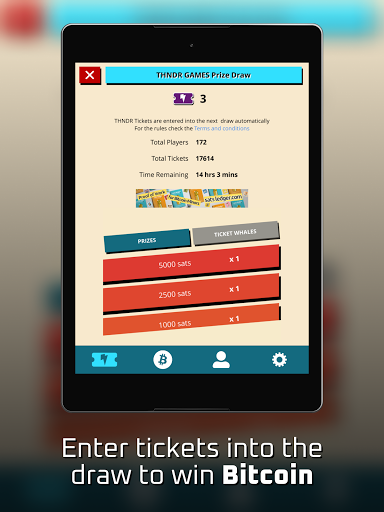 To enter the draw you collect THNDR Tickets. Each one counts as an entry to the daily draw in which you can win a bitcoin prize. If you win you can cash out instantly to one of these supported Bitcoin wallet apps with 'Lightning Network' support on Google Play; ZEBEDEE, Wallet of Satoshi, Breez, Blue Wallet, Bitcoin Lightning Wallet and Zeus.
