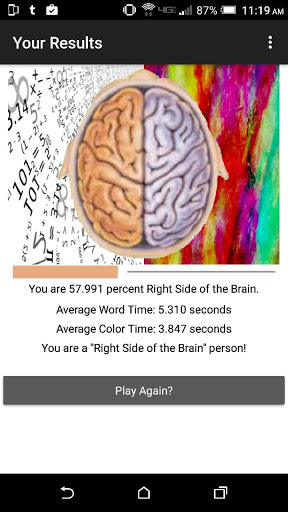 Brain Sider is a game that asks you a series of questions and then gives you feedback based on your responses. Studies show that the right side of the brain triggers creative thinking and the left side of the brain triggers logical thinking. In Brain Sider, a color will supposedly trigger the right side of your brain and a word will supposedly trigger the left side of your brain.