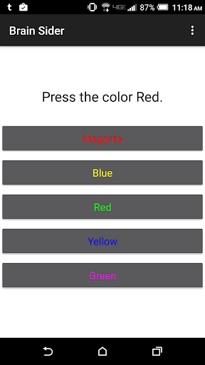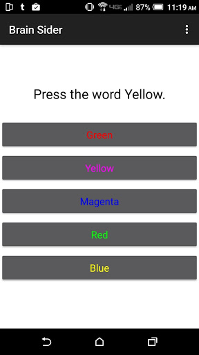 You will have to respond to 10 different randomly selected prompts. There will be 5 different buttons, each of them with different words and different color text. The two different prompts will ask you to either select a button with a certain color text or a button with a certain word. You will have to distinguish the difference between the two and decide which button best matches the description.
