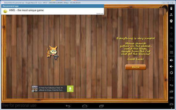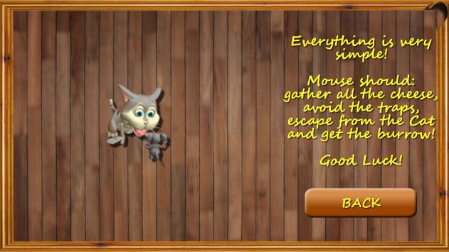 Everything is very simple! Mouse should: gather all the cheese, avoid the traps, escape from the Cat and get the burrow! Now, every time, cheese and traps are placed randomly.