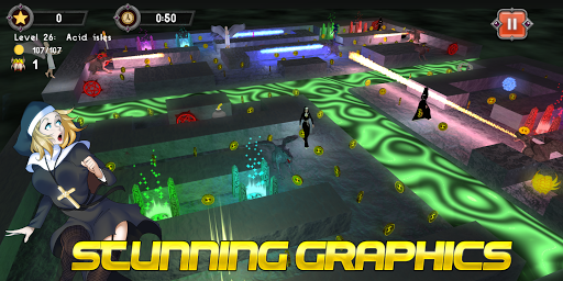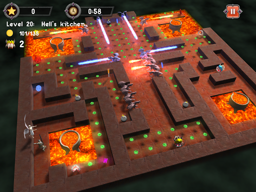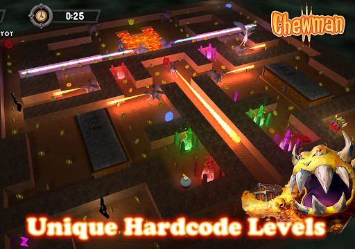 Chewman is a demon, who is hunting for treasure and lives of innocent humans in the Maze. His enemies are Ancient Holy Order (knights, priests, nuns and angels) and other treasure hunters - witches and demons. Each enemy has some features and weaknesses. There are several power-ups on each map, like speed, move-through-walls or freeze enemies. Also there are teleports and traps like lava lakes or gargoyles breathing streams of fire. The objective is to collect all coins on the map, as fast as possible (or without losing lives).