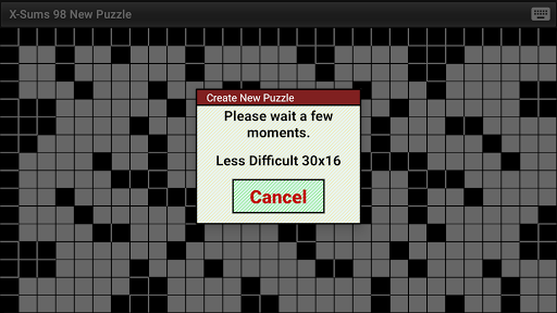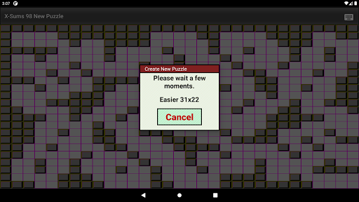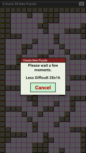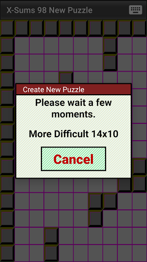 To create a new Kakuro puzzle: Select 1 of 5 difficulty levels. Drag to any puzzle size from 9x12 to 23x31, or double tap to select from a few pre-selected sizes. Touch the screen to generate a new Kakuro puzzle. Puzzle creation is very fast for easier or smaller puzzles on modern devices.