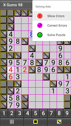 Built-in solving aids: Enter up to six, small trial digits per square. Get hints. Show errors. Correct Errors. Show the solution. Optional audio warning for duplicate digits or incorrect sums.
