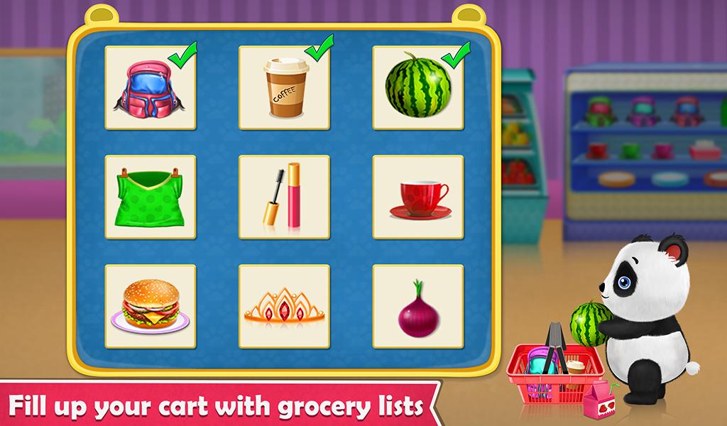 Explore real life shopping experience with shopping game – Get your daily shopping list, move through different departments, search and gather your items. Help Panda to find all the products which are in the shopping list. Look attentive at the shop shelves, departments and when you see your product from the list, just tap and put it to the trolley.