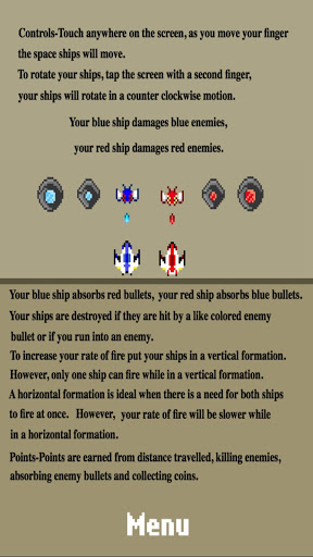 Fight your way through swarms of enemies controlling both the red and blue ships. When one is out in front of the other it doubles the rate of fire, but the red and blue ships can only destroy enemies of the same color. To pivot the ships around tap the screen with two fingers. How long can you survive?