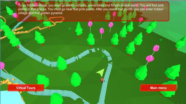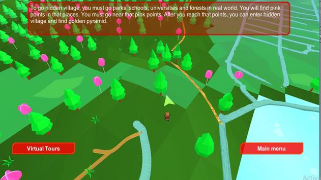 In this worlds, one world is linked with real world. To go this world, players are need to go parks, forests, schools and universities in real world. When players are reach near parks, forest, school and university, they will see special marks. You need to go near that special pink marks to reach hidden village.