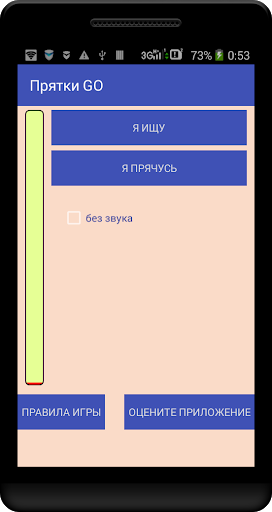 Все участники игры устанавливают на свои смартфоны приложение "Прятки GO". Тот участник, который будет прятаться, нажимает кнопку "Я прячусь" и начинает прятаться. Через определенное время остальные участники начинают его искать нажав на кнопку "Я ищу", определяя по индикатору как далеко они находятся от спрятавшегося участника. Удачи в игре!