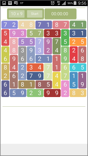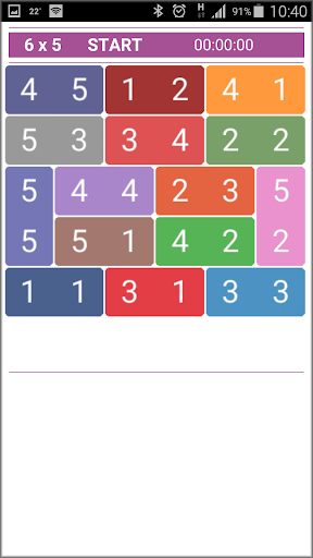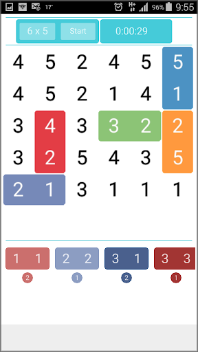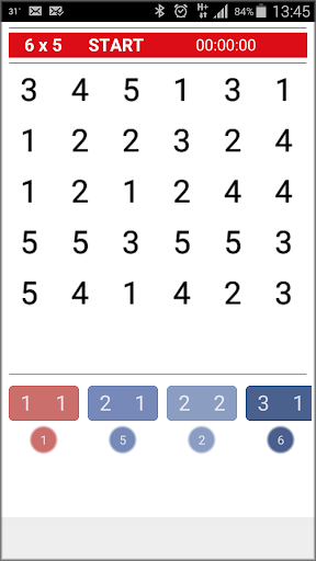 The game board contains a set of tiles whose outlines have been removed. The tiles in the list bellow exactly fill the board. Your task is to outline the tiles by "sliding" between two numeric values on the board. Tiles may be oriented vertically or horizontally and with numbers in either order. If you make a mistake, any tile may be removed from the board by clicking on it.