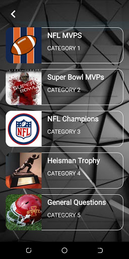 Quiz on American Football More Football Questions Coming soon Questions on: 1. NFL Champions 2. NFL MVPs 3. Super Bowl Champions 4. Super Bowl MVPs 5. American Football General Questions