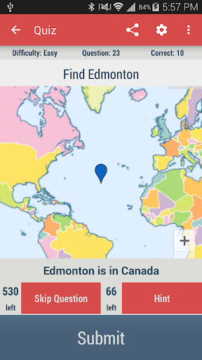 - Six different questions types to test your knowledge such as world capitals, country borders, area, population, and world cities.